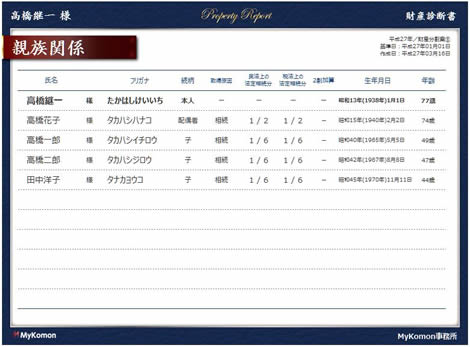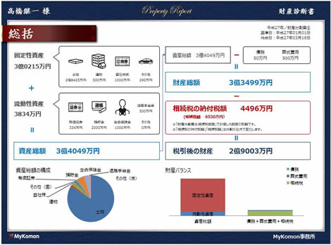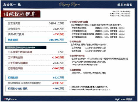 平成27年1月1日以降、相続税の基礎控除が「5,000万円+1,000万円×法定相続人の数」から「3,000万円+600万円×法定相続人の数」に改正され、Q-TAX京都宇治店 ケイ・アイ&パートナーズ税理士法人(旧:黒瀬税理士事務所)でも問い合わせや申告件数が増えてきました。不動産や預金・株式など評価して集計していくと相続税が掛かるケースがあります。当事務所では、事前に相続対策ができるように相続財産シミュレーションを行っており、以下のような簡単で見やすい帳票を基に丁寧に説明させて頂きます。