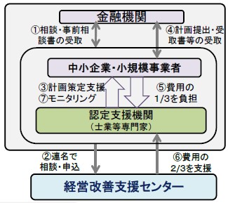 平成29年5月29日から早期経営改善計画の策定支援制度がスタートしています。これは、国が認める士業等の専門家の支援を受けて資金実績・事業計画表やビジネスモデル俯瞰図など早期の経営改善計画書を策定する場合、専門家に対する支払費用の2/3(上限20万円まで)の支援を受けることができます。