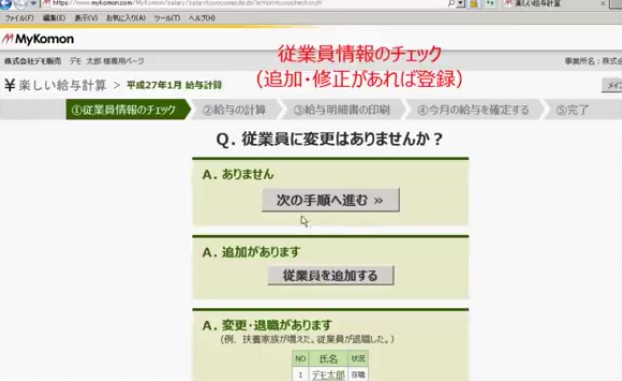 毎月の給与計算は、従業員の変更が「ありません」「追加があります」「変更・退職があります」といった3つの項目を確認していただくだけのシンプルなメニュー画面です。「ありません」をクリックするとすぐに給与計算が行えます。「追加があります」は従業員を採用した時に、氏名や住所・生年月日・給与基礎情報(時給、日給、月給、手当、社会保険等級、住民税など)の基礎情報を登録してから給与計算に進みます。「変更・退職があります」は従業員の給与や住民税などの変更や退職者の退職日などを登録してから給与計算へ進むことができる簡単なつくりになっています。