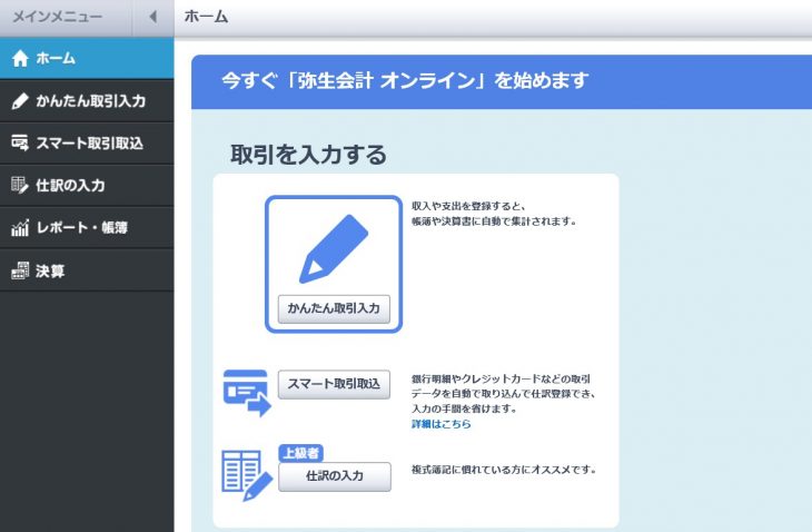 おすすめの使い方は、預金やクレッジットカード取引は「スマート取引取込」で会計処理を行い、経費の支払いなど極力クレジットカードを利用することで、事業の取引の大半を自動取込により処理を行えれば、事務作業の効率化につながります。どうしても手入力すべき取引は「かんたん取引入力」でサクサクっと入力が行えます。