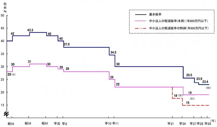法人税率はこのように昭和59年を境に法人税率は大幅に下がっています。