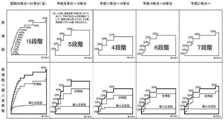 所得税率はこのように平成11年~18年分を境に最高税率が大幅に上がってきています。