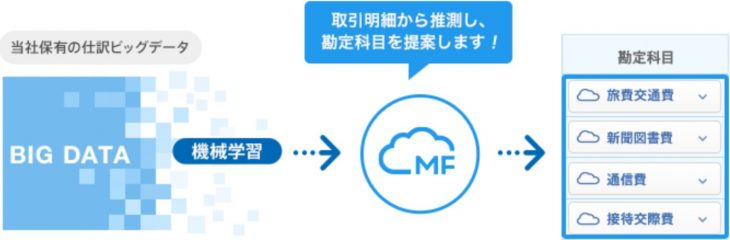 MFクラウド保有の仕訳ビックデータを元に、MFクラウド上で勘定科目を提案してくれます。これは、連携サービス入力画面上の「雲のマーク」がついた勘定科目が提案機能です。2016年8月30日の機械学習を活用した勘定科目提案機能のバージョンアップにより、より精度の高い自動仕訳が可能になりました。