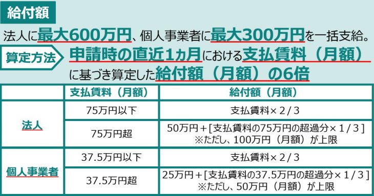 ●給付率1/3の上乗せ分が適用され、給付額(月額)の上限が100万円や50万円になるのは、複数店舗を有する事業者だけでなく、支払賃料が高額な事業者であれば、有する店舗数が1つであっても適用されます。