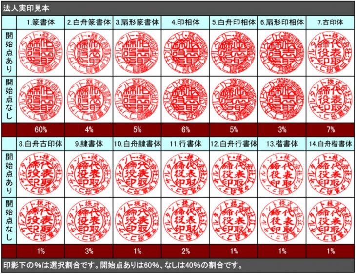 1番人気はなんといっても「篆書体(てんしょたい)」です。印影下の%は一般的な選択割合です。印鑑の書体は好みがあると思うのですが、個人的には「篆書体」や「扇形篆書体」が好みです。また、開始点は印鑑は個人印とちがい、どちらが上なの?って迷われることがあります。開始点があれば見やすいですが、個人的にはスッキリした見栄えになるので開始点なしが好みです。