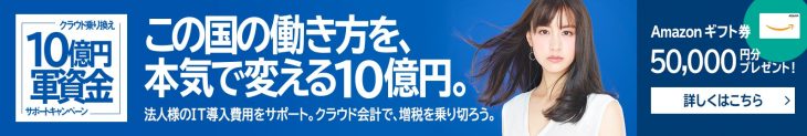マネーフォワードクラウドでは、法人でビジネス年額プランを2019年12月末までにクレジットカード決済をされますと、Amazon ギフト券 50,000円分プレゼントのキャンペーンを行ってます。今がチャンスとなりますのでご検討されてみてはいかがでしょうか。