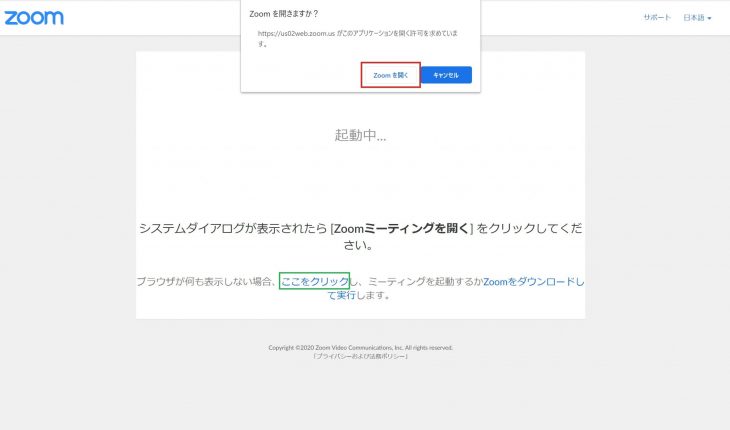 招待URLクリック後、以下の画面が表示されますので、初めてZoomをお使いの方は緑枠の部分(ここをクリック)をクリックしていただき、Zoomアプリケーションをダウンロードしてください。ダウンロード完了後に赤枠部分(Zoomを開く)をクリックしていただきます。