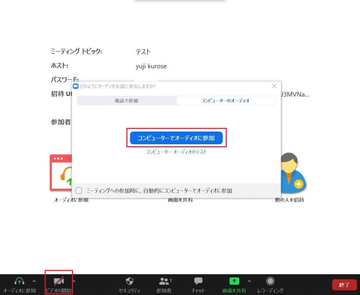 どのようにオーディオ会議に参加しますか?という以下の画面が表示されましたら、赤枠部分の「コンピューターでオーディオに参加」と、下部のタスクバーの「ビデオの開始」をクリックしていていただくだけで簡単にwebミーティングへ参加していただくことができます。使用料はもちろん無料です。
